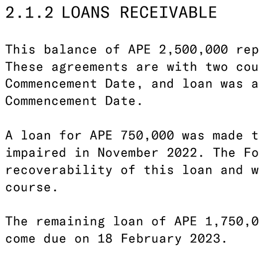 The Foundation states in the “Loans Receivable” section of the report that “a balance of APE 2,500,000 represents loans to market makers.”